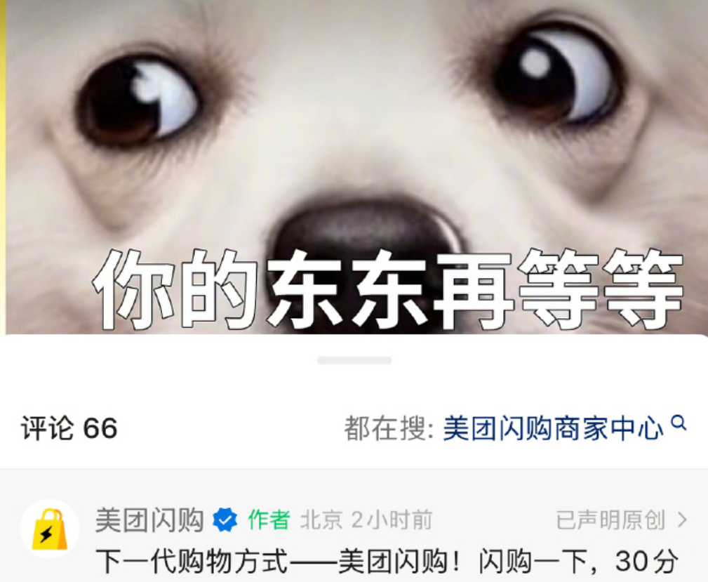 4月15日10点,美团正式发布了即时零售品牌“美团闪购”,品牌视频中有狗狗的镜头,并配了字幕“你的东东再等等”,这里在内涵什么,大家继续自行判断。