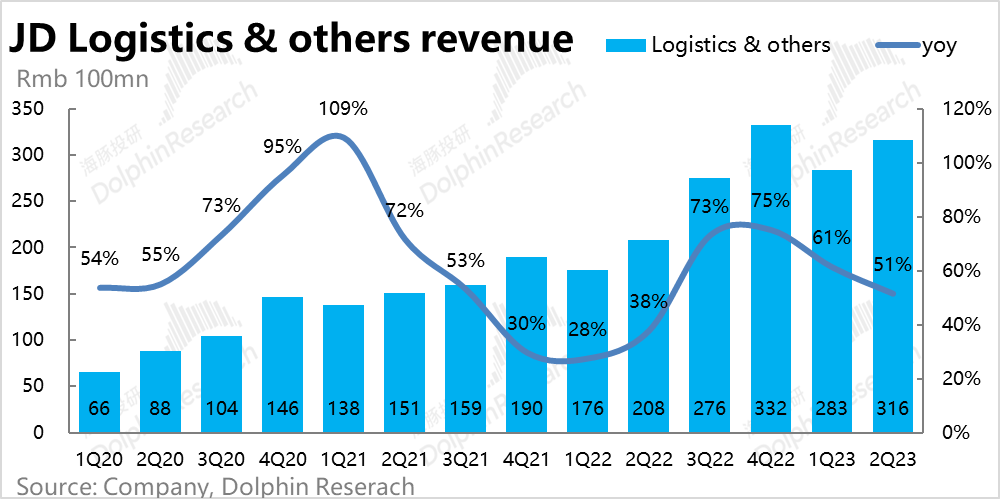 3.物流与其他服务:包括京东物流、达达快送、和德邦物流的物流板块本季度收入316亿元,略微高于市场预期。