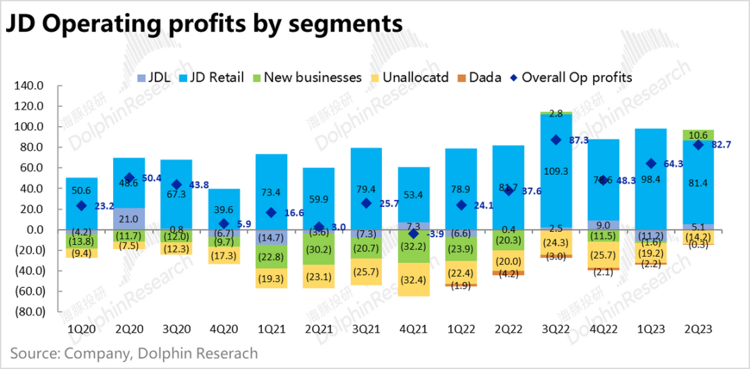 集团整体经营利润本季度为82.7亿,是显著超出市场预期的约60亿。但超预期主要原因是本季度确认了10亿的资产处置收益和物流、新业务板块的减亏,核心的商城板块的经营利润反而不及预期。