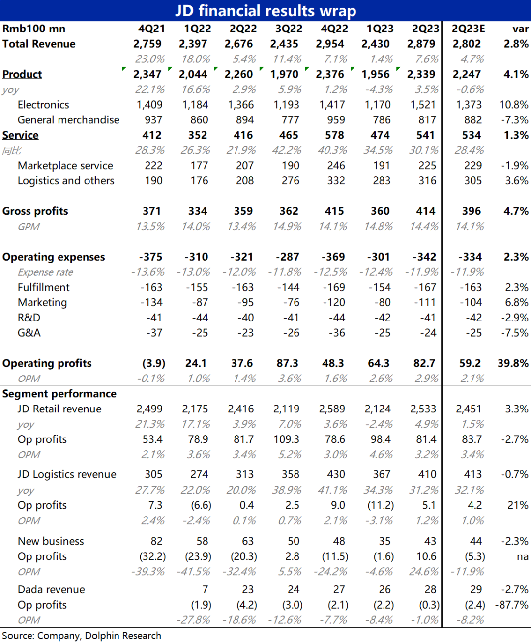 1. 先看整体业绩,本季度京东整体实现收入2879亿元,同比增速近8%,好于卖方5%左右的增速预期。而整体经营利润本季度为82.7亿,也显著高于市场预期的约60亿。