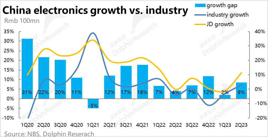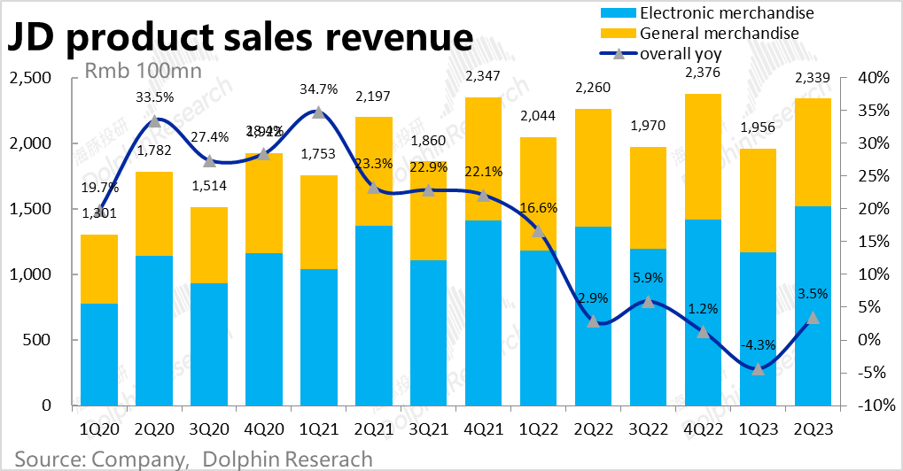 本季度商城板块收入为2533亿,同比增长了4.9%,明显好于公司最先零增长的指引,也高于后续指引上调后低个位数的增长预期。具体来看,主要是通电类产品收入同比增长了11%,明显高于大盘增速,也高出市场预期约10%。考虑到国内家电+电子产品整体大盘的销售今年的复苏程度并不算好(二季度同比增长仅3%)。海豚君原先也担心京东在通电产品上的份额在进一步被侵蚀,但实际看来京东的增速反而明显超出大盘增速,是本季财报最大的惊喜。