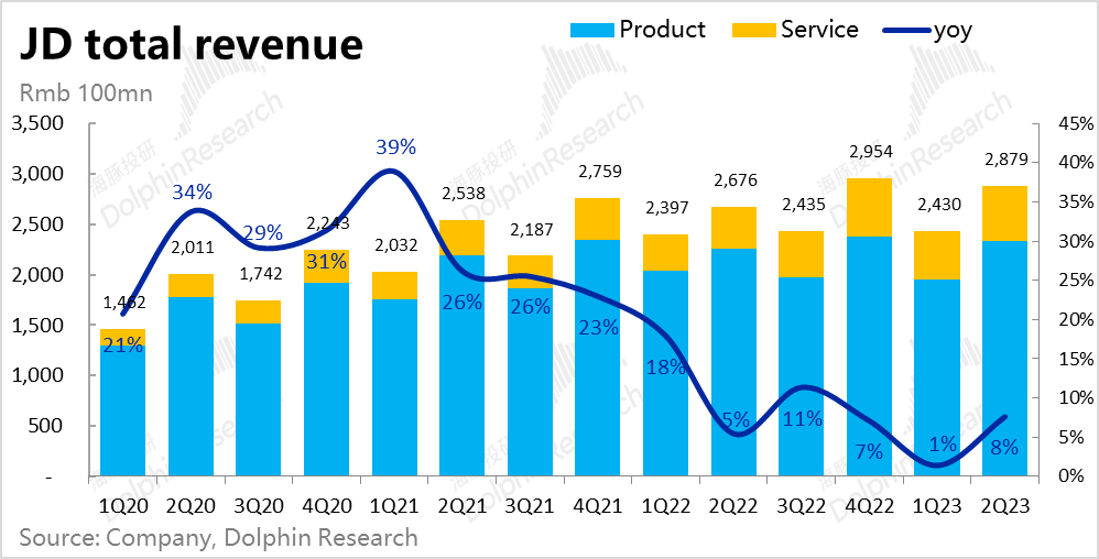 具体来看,本季通电类产品本季收入1521亿元,同比增长了11%,也比市场预期高了约10%。考虑到国内家电+电子产品整体大盘的销售今年以来的复苏程度并不算好(二季度同比增长仅3%),而早先公布业绩的淘天集团也表示二季度电子产品销售出色、推动了收入增长。海豚君原先担心京东在通电产品上的份额在进一步被侵蚀,但实际看来京东的增速反而明显超出大盘增速,是本季财报主要超预期的点。