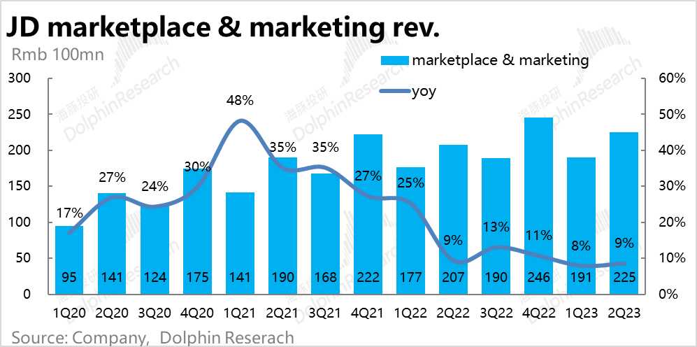 2、平台服务:反映主站和京东到家平台上3P卖家服务的佣金和广告业务本季收入225亿元,略微低于预期的229亿。在去年的极低基数下,同比增速仍仅为9%,可见表现并不好。