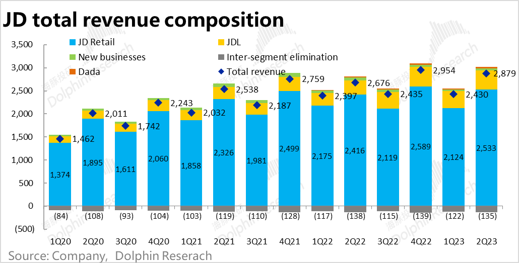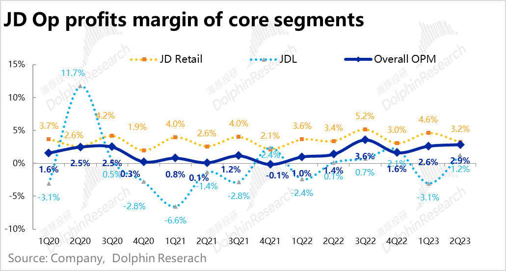 1、核心的自营零售业务,本季实现收入2339亿元,同比增长了3.5%,虽然绝对增速仍显著跑输大盘和同行,但考虑到部分业务1P变3P对收入的拖累,相比公司先前同比零增长的指引还是要更好的。