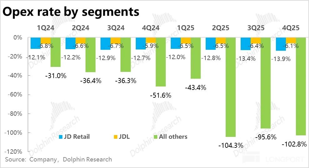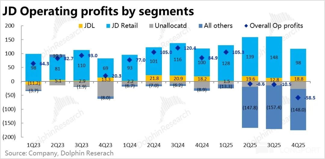 2)京东物流本季的经营利润同样略低于预期,在收入同比增长不俗的情况下,利润仅增长了 3%。基本也是闪购&外卖配送补,利润率较低、乃至是亏损的拖累。