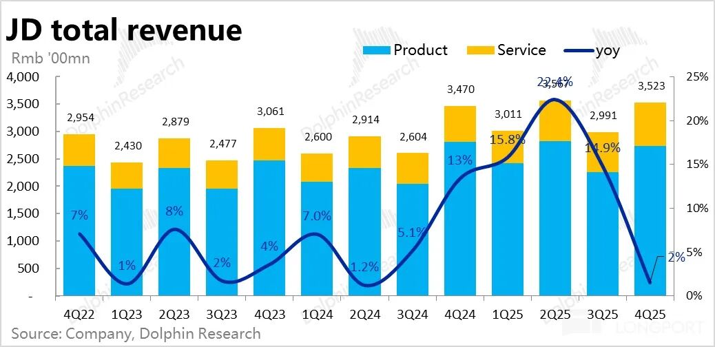 具体来看,一般商品销售增长 12%,包括 3P 商家服务和物流服务的服务型收入增同比增了 20%,都还算不差,也大体符合卖方预期。