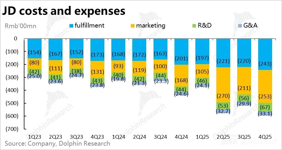 从分费用类型的视角,主要是履约费用和营销费用的占比提升比较明显,和因闪购业务产生的运费补贴(传统电商的运费可能也在提升)、以及要出资代替国补的情况相符。