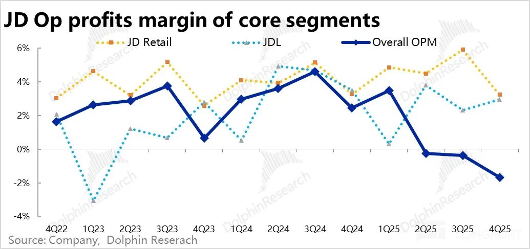 1)首先在核心商城板块上,由于国补的退坡和 24Q4~25H2 的高基数,至少在 26 上半年,京东通电商品销售很可能会继续出现比较明显下滑(本季主要是家电变差,26 年手机很可能也会变成拖累)。