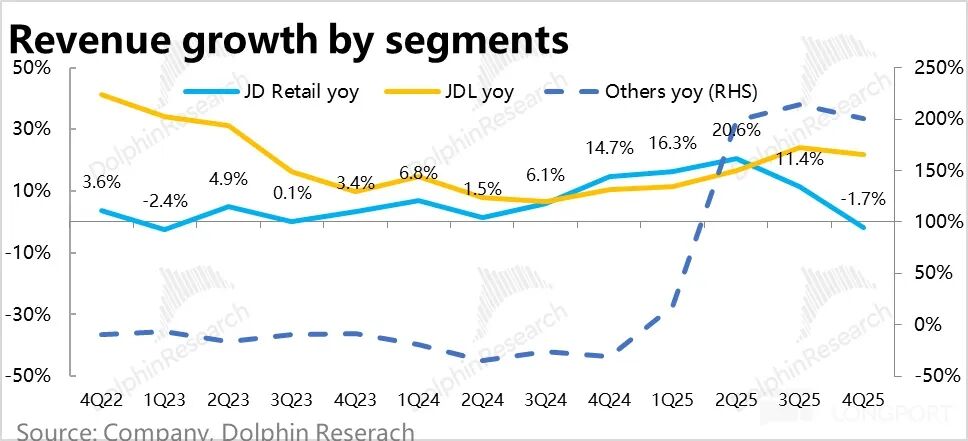 包括京东物流和闪购配送收入的物流性收入本季同比增长近 24%,较此前外卖投入高峰期 35% 左右的增速有不小的下降,隐含京东外卖&闪购的业务量确实是环比有所下滑的。