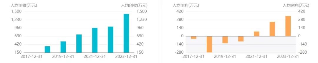 若按前述数据粗略计算,拼多多去年平均每个员工可以创造1422.97万元的收入、344.92万元的净利润。而将时间线进一步拉长来看,自2018年起,拼多多的人均创收和人均创利指标便呈现出逐年上升的趋势。