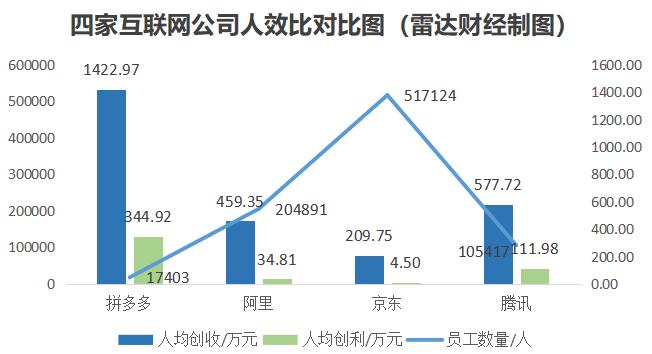 从人均创收指标来看,拼多多是阿里的3.1倍、京东的6.78倍、腾讯的2.46倍;从人均创利指标来看,拼多多是阿里的9.91倍、腾讯的3.08倍,更是京东的76.65倍。