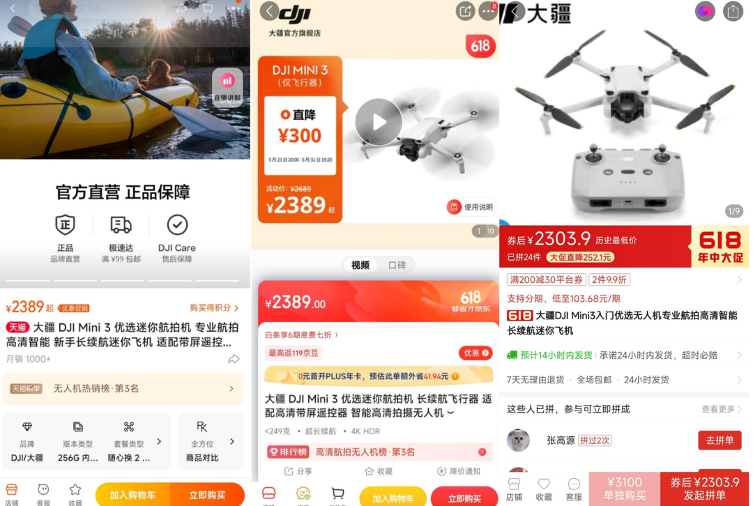 与此同时,大疆Mini3无人机,在天猫上的最低售价,来自大疆官方旗舰店,售价为2389元;京东上的最低价格,同样来自大疆官方旗舰店,到手价同样为2389元;在拼多多上的最低售价,为一家个人店铺的2303.9元。