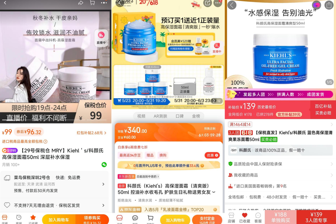 潘哥发现,在化妆品类商品中,50毫升的科颜氏高保湿面霜,在淘宝上的最低售价,来自全球购某个人店铺,含税价格为99元,虽然包装为白瓶,但与蓝瓶为同一种商品;在京东上的最低售价,为340元;在拼多多上的最低价,为补贴后的139元。
