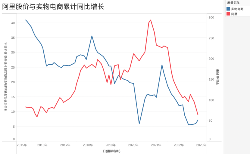 由于三家企业保持高度的相关性,我们主要对比阿里与全国实物电商的走势情况,见下图