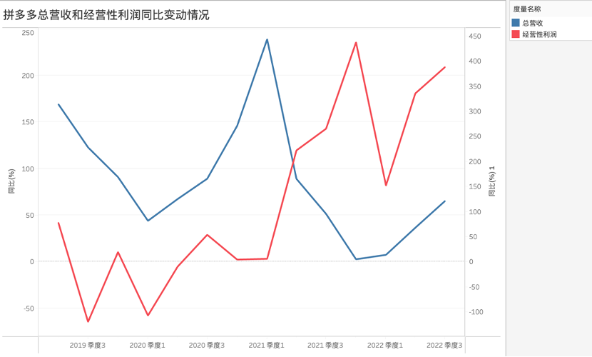 我们首先整理了2019年至今拼多多总营收和经营性利润的同比变动情况,见下图