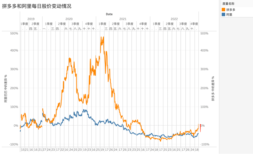 我们再看拼多多的先进性,我们整理了拼多多和阿里每日股价变动情况,见下图