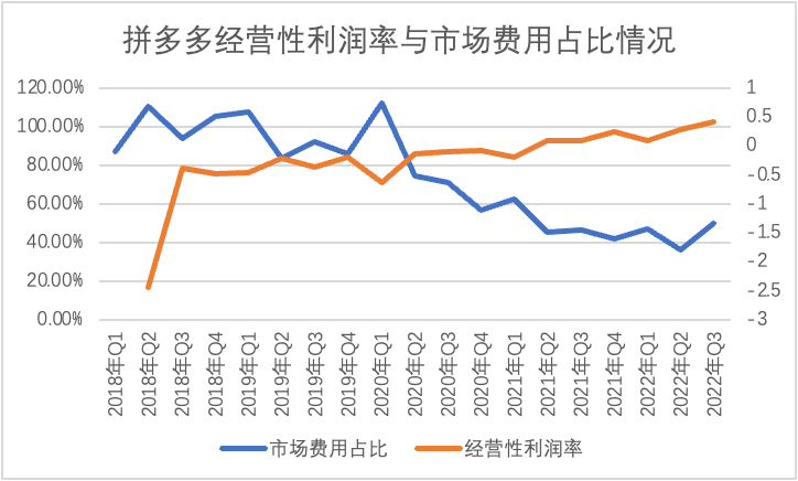 在上图中我们可以看到,2020年之后的,拼多多市场费用占比呈现快速的下行趋势,与此同时经营性利润逐渐好转,不过相较之下,经营性利润的变动幅度要弱于市场费用。