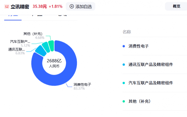 其财报数据显示:2024年,消费电子业务、通讯互联产品级精密组件、汽车互联产品级精密组件、其他业务的营收分别为2241亿、183.6亿、137.58亿、125.84亿元,营收贡献率分别为83.37%、6.83%、5.12%、4.68%。