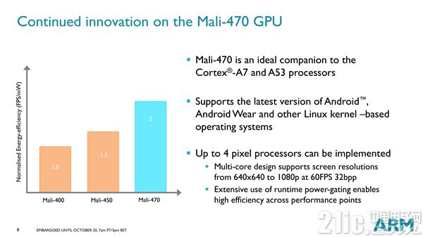 Mali470最大的改进就是尺寸和功耗的优化,这两点都是可穿戴的硬性要求。在相同的图像表现下,470的功耗仅为400的一半。在可穿戴设备目前技术创新较难的情况下,提供更优异的图像体验和交互能够让厂商更易打造差异化的产品。