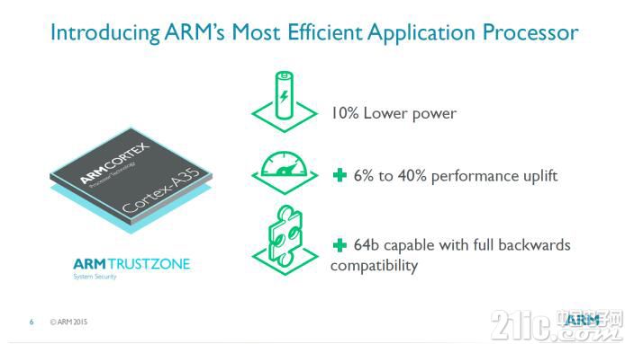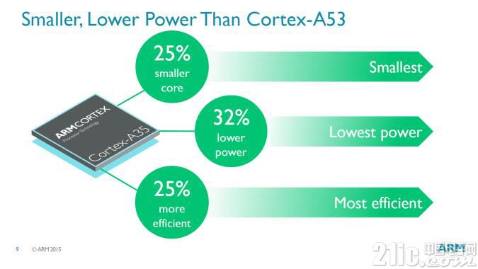 而在ARM于今年光棍节发布的Cortex-A35处理器,是ARM全新架构ARMv8-A的首颗芯片。据James介绍,Cortex-A35很自然地承袭了以功耗效率和体积小巧著称的Cortex-A7,迄今已有超过十亿支智能手机和平板计算机搭载Cortex-A7。此次推出全球最高功效的64位移动处理器,ARM和合作伙伴将为下一个十亿智能手机用户带去64位运算的优势。此款芯片被ARM宣称为全球最高功效的64位移动处理器,将A35与老前辈A53比较一下:A35的每个核的功耗降低了33%,芯片面积减少了25%。