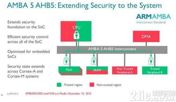 在今年8月份的Defcon黑客大会上,有两位安全专家公开黑进了特斯拉,引起一片哗然,安全问题成为了物联网发展的扼喉之爪。而在北京ARM Tech Symposia当日, ARM处理器部门总经理 James McNiven以”Bulid Trust In a Connect World”开启了2015上午的主题演讲。Trust和Secruty成为当天发布会上的高频词汇。要实现信任与安全,当然要从最最最底层—-芯片架构做起。ARMv8-M架构就是ARM的神级杀手锏。