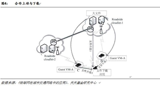 合作上传和下载是基于带宽共享的有趣应用。许多新的应用包含大容量数据上传或下载,比如车内多媒体娱乐、基于位置的富媒体广告以及大邮件服务等。车载环境下,无线带宽受限、车辆移动造成网络拓扑多变,使得车辆难以在某一特定RSU下完成大文件的上传或下载。在这里,我们展示如何利用车载云有效克服这类应用的困难。