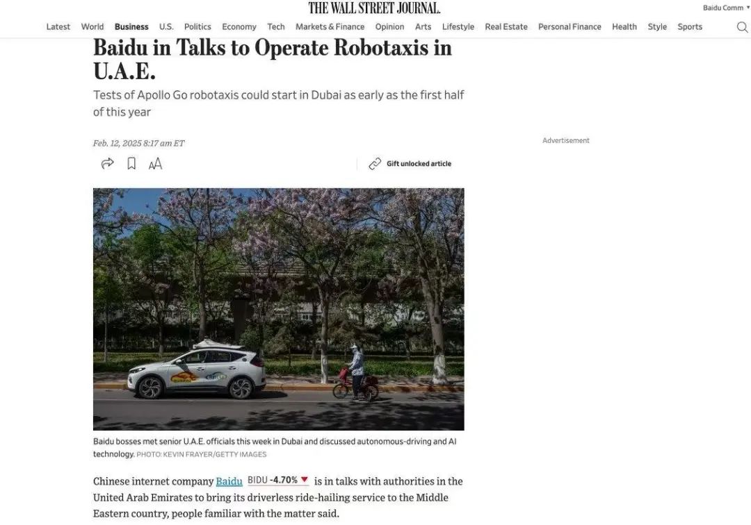 《华尔街日报》最新报道则明确指出,萝卜快跑最早将于今年上半年在迪拜开始测试。知情人士称,百度正在与阿联酋当局进行谈判,计划将其无人驾驶出租车服务引入这个中东国家。萝卜快跑还在加强迪拜、阿布扎比和利雅得等中东城市以及东南亚国家业务团队的发展。