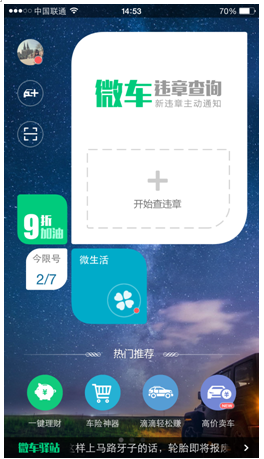 当用户打开App时,除了满足自身的需求之外,一定期望该产品有着丰富的“内涵”,该“内涵”就包括交互体验、UI设计、分享机制等。微车在App首页只展示了现有的几个主要业务,并没有太多冗杂的设计或模块。同时,首页的微车驿站和跑马灯更成为了展示微车的第二个窗口,客户不仅可以看到微车最新的活动信息,还可通过该窗口跟微车互动,形成用户反馈机制。