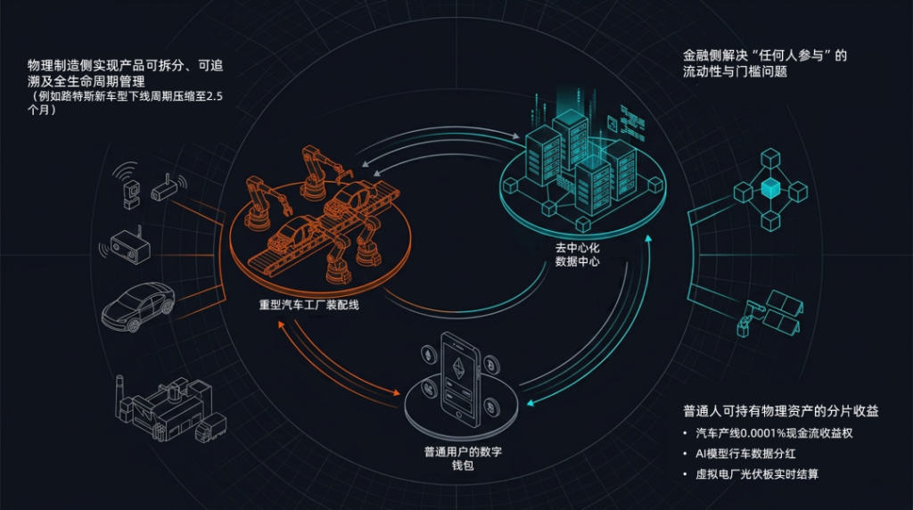 普通人未来能持有的,将不再只是一篮子代币化的国债,或者一个货币市场基金的份额;它可能是我参与定制的那条汽车产线0.0001%的现金流收益权,是我贡献的行车数据在AI模型训练中的一小份分红,是我家屋顶那块光伏板在虚拟电厂里被调度时的一笔实时结算。