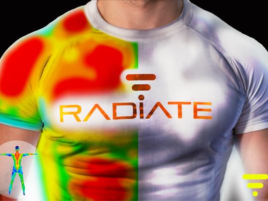 Radiate是一款能够帮助运动者监测身体特定部位或肌肉群的训练情况的运动T恤。人在运动时体内新陈代谢、血液流动及肌肉膨胀的程度会不断产生变化,继而使人体散发出不同的热量。Radiate就像一面贴身热能镜,能即时感应运动者身体各个部位所散发的热量,并通过颜色的变化来传递信息,让运动者随时了解到自己的肌肉及血管得到的锻炼情况。