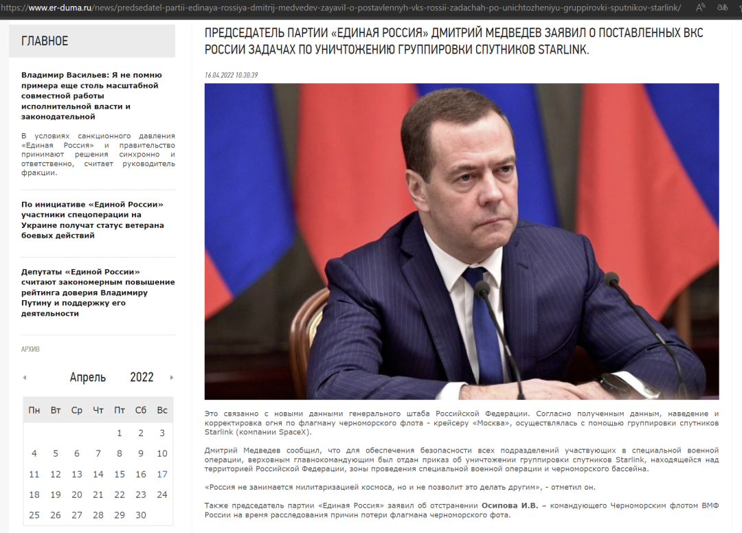 根据这份事实上的官方公告,俄罗斯前总统、联邦安全会议副主席、统一俄罗斯党现任主席,普京的忠实搭档德米特里·梅德韦杰夫,普京已经正式向俄罗斯航空航天部队下达了摧毁“星链”的命令。