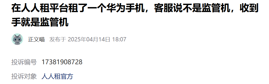 2025年4月9日,“正义喵”通过支付宝在人人租平台租赁了一台华为mate 70 pro+手机。在发货前,“正义喵”还专门问了客服手机是不是监管机,客服回复“不是监管机”。