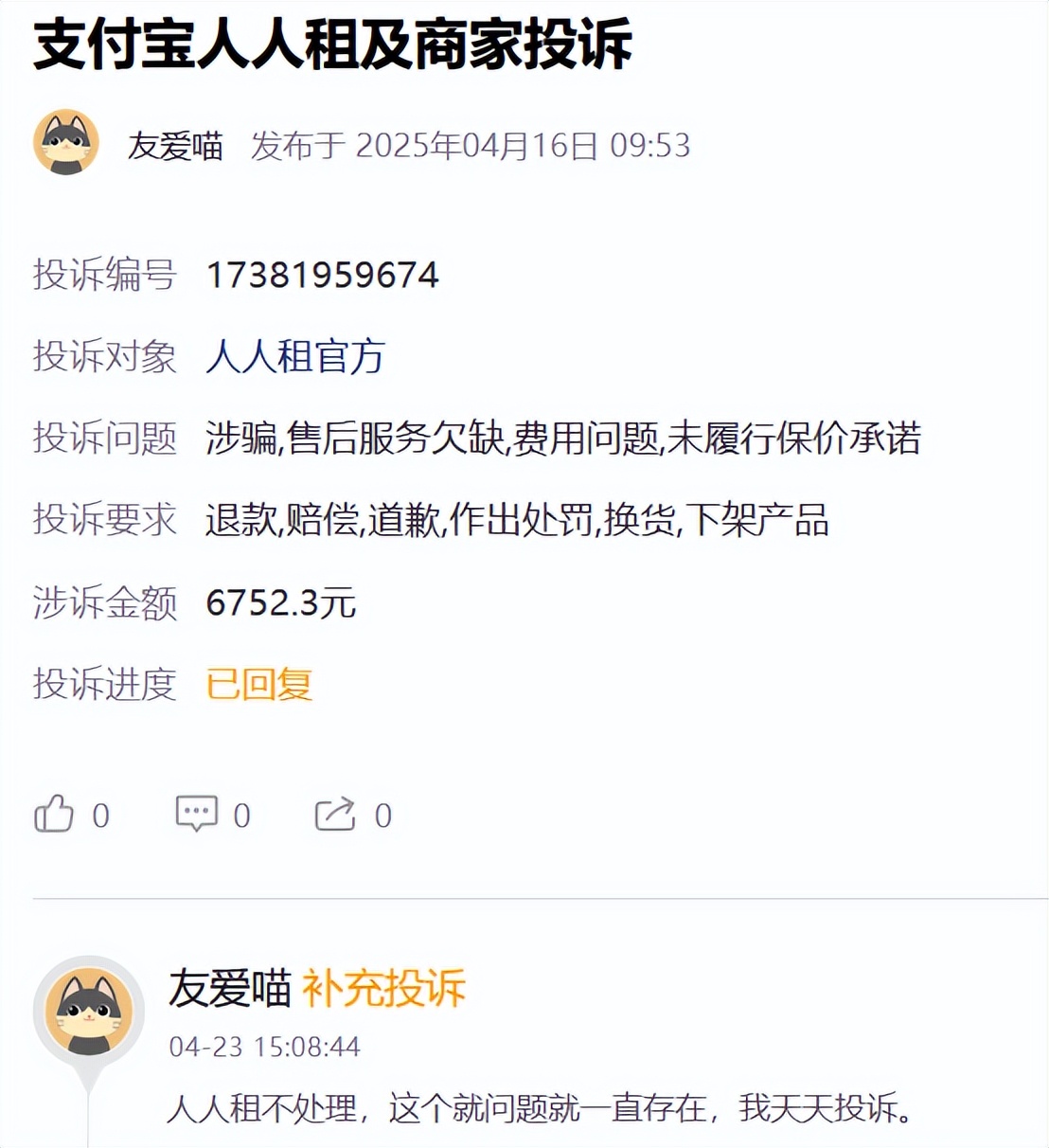 4月23日,“友爱喵”直接摊牌了:“人人租不处理,这个就问题就一直存在,我天天投诉。”
