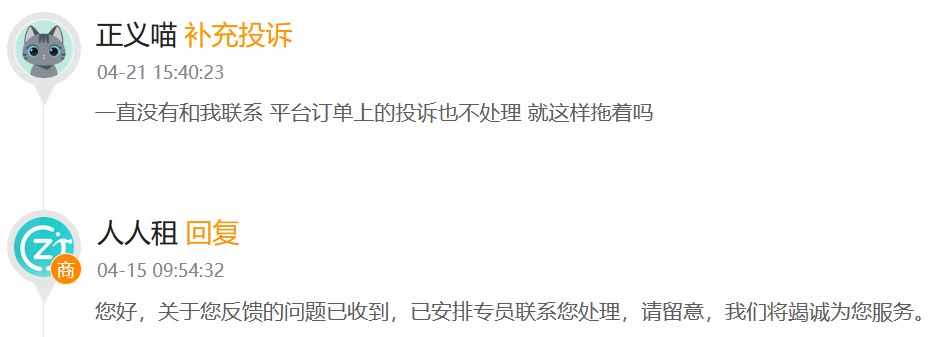 对于“正义喵”在黑猫投诉上的留言,4月15日,人人租表示会安排专员联系其进行投诉处理。但是直到4月21日15:40,人人租方面也没有动作。“一直没有和我联系,平台订单上的投诉也不处理,就这样拖着吗?”被“晾着”的“正义喵”在平台上质问。