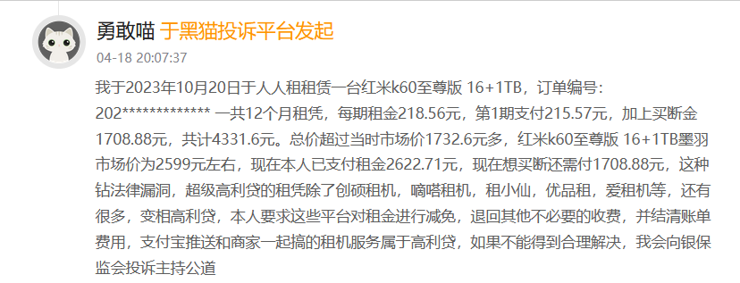 在黑猫投诉上,消费者“勇敢喵”(化名)有着同样的烦恼。其于2023年10月20日在人人租平台上租赁了一台红米k60至尊版16+1TB,租期为12个月,每期租金218.56元,加上买断金1708.88元,共计4331.6元。