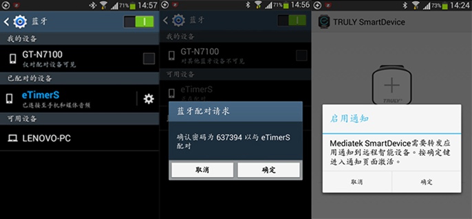 安装好App后还需要激活设备,打开APP,点击确定,激活设备。首先要启动手表的蓝牙,然后手机搜索设备点击配对,会弹出密码,确定之后在手表端输入密码,即可完成配对,轻松愉快。