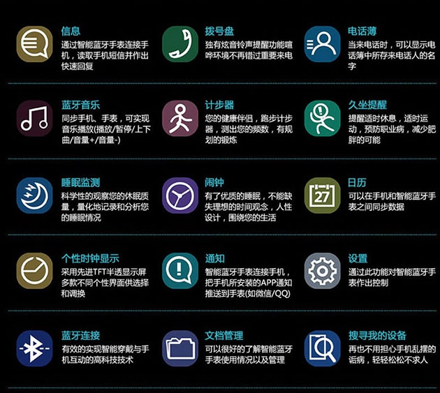 打开手表界面可以发现,信利Truly智能手表的功能十分全面,据目前介绍能够满足商务人士的大部分需求。