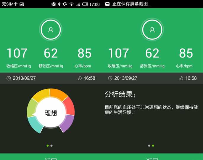 配合血压计测量完成,手机界面会显示处收缩压、舒张压和心率,在下面还会根据用户自身的数据得出一个血压的指示:向右滑动可以看到针对目前血压状况所给出的建议