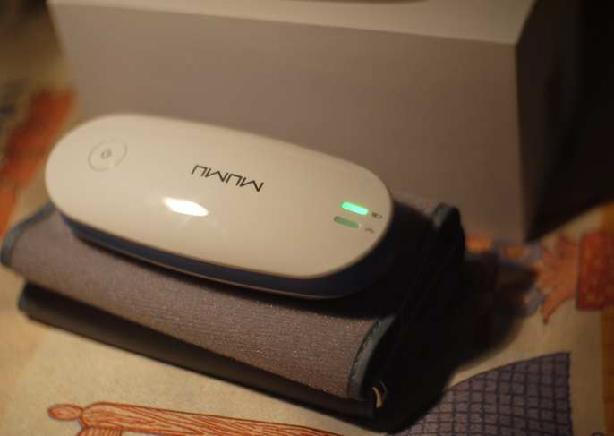 从外观上来说,MUMU BP2 与传统的血压计有较大的区别:在 BP2 上没有传统血压计的显示屏,因此外观看起来更加一体化更加圆润。造型设计简单,在之前我们的微博互动猜环节上不少网友都认为这个是移动电源或者是随身 WIFI。在正面只有电源键和两个指示灯,分别是电源指示和蓝牙指示。