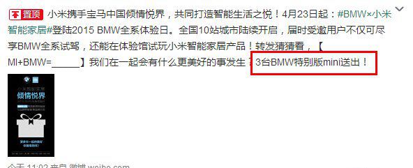 智能家居行业从不缺少关注,但却缺少大众用户对智能家居产品的了解。昨天,在小米官方微博置顶了一条信息,消息表明小米将联合宝马中国推出智能家居体验馆,将在全国10站城市陆续开启,受邀用户不仅可以试驾BMW全系,还可在体验馆试玩小米智能家居产品。听上去确实不错,但如何受邀则成了谜团,不禁让人产生疑问,此次合作究竟是促进用户了解智能家居产品,还是为了博眼球?