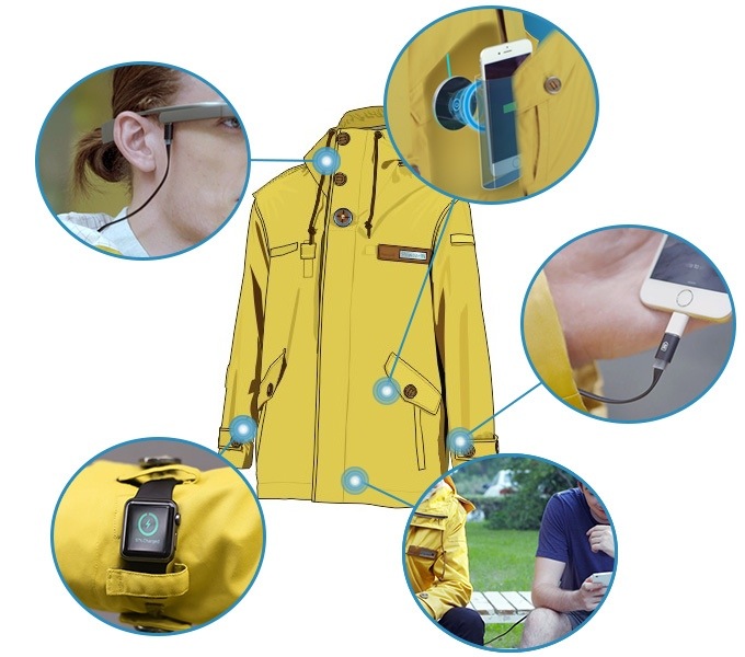 内置于袖口的手持式充电线能够让用户在使用手机的同时为设备充电;衣服底部植入的充电线能够让用户将充电器方便地借给别人使用;领口处的充电器能够为智能眼镜充电;另外手腕处还有一个充电器,为智能手表供电。