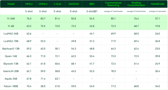 从更为全面的评估看,在全球大模型各项评测中最关键的 “MMLU”(Massive Multitask Language Understanding 大规模多任务语言理解)、BBH等反映模型综合能力的评测集上,Yi-34B 同样表现突出,在通用能力、知识推理、阅读理解等多项指标评比中全部胜出。