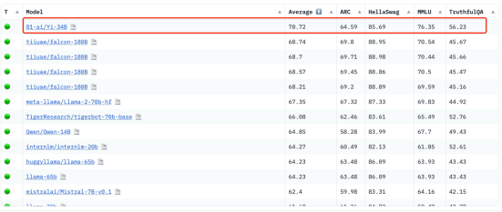 在 Hugging Face英文测试公开榜单Pretrained预训练开源模型排名中,Yi-34B以70.72 分位列全球第一,碾压 LLaMA2-70B 和 Falcon-180B 等众多大尺寸模型。