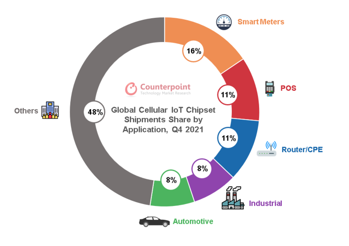2021年第四季度全球蜂窝物联网芯片市场(来源:Counterpoint,物联网智库制图)