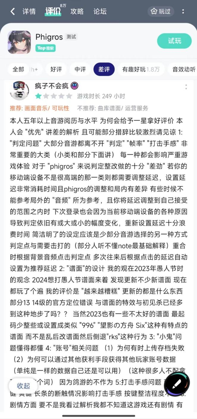 从评论内容也能看出,一些Phigros的原生玩家,是十分热爱且珍惜自己的小圈子的,他们对于这波泼天的流量富贵,并不感冒,甚至有些排斥。原因也不难推断——一个原本是圈地自萌的亚文化同好游戏,被流量推到聚光灯下,无论结果好坏,这个圈子必然不会像原先那般纯粹且热爱。