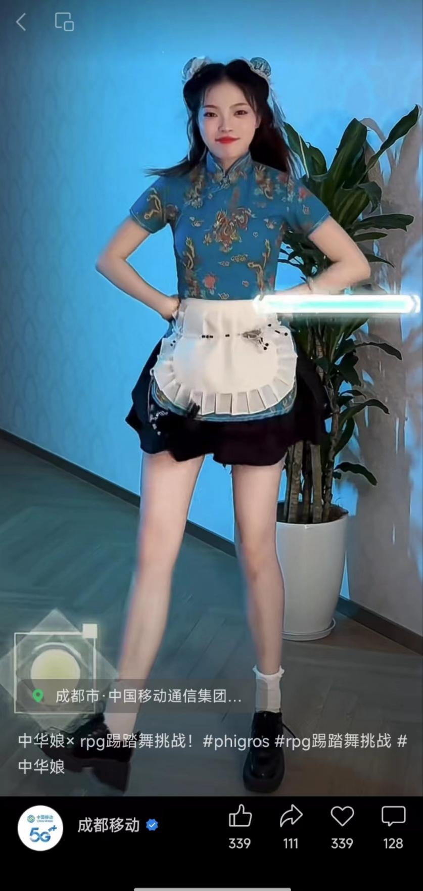 在Phigros的相关的二创刷爆抖音之后,成都移动的官方视频号,也发布了同样的卡点舞视频,甚至还结合了另外一个刷屏的中华娘要素。这算是给Phigros来了个“盖章认证”。
