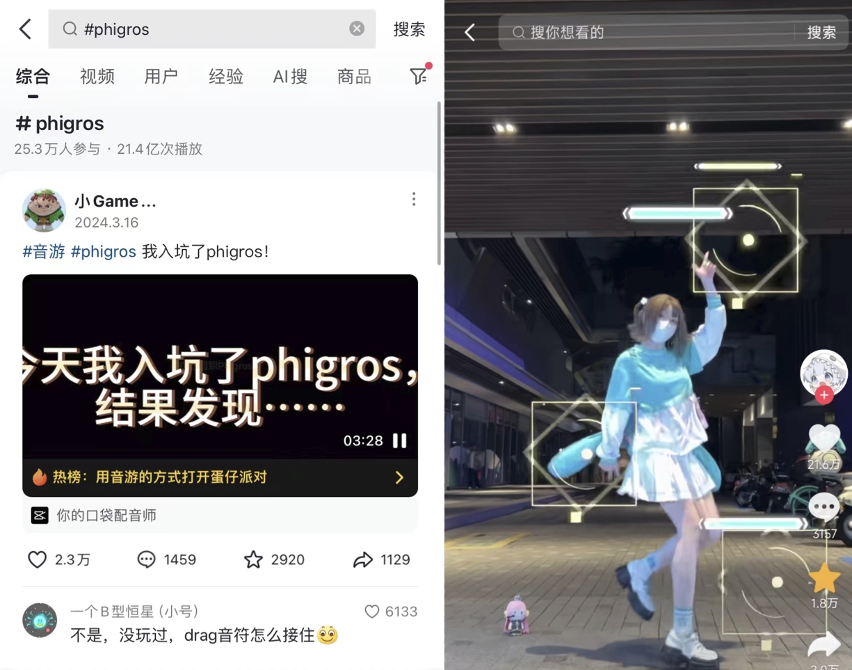 最近,免费音乐游戏Phigros的玩家们,就遭遇了类似的事情——由于这款游戏的UI和特效极具动感,且与卡点舞意外契合,抖音上的各路小姐姐纷纷变成了Phigros的形状。而这让原先的老玩家们感到无所适从。