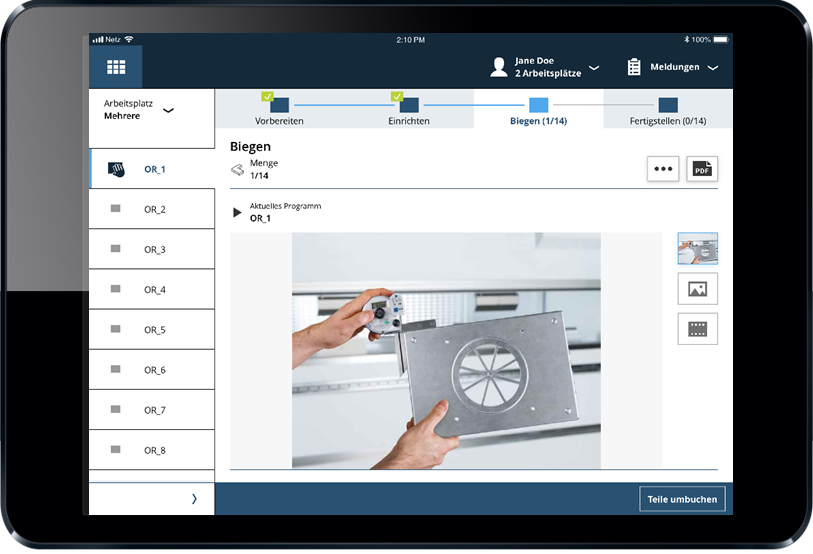 Oeon软件的车间数字助手Workmate可为每个加工步骤提供必要的与生产有关的信息——无论是2D激光切割、冲床、折弯还是手动焊接、组装、喷涂,都可以根据工位的类型,指导生产员工完成即将到来的生产过程中的各个步骤。
