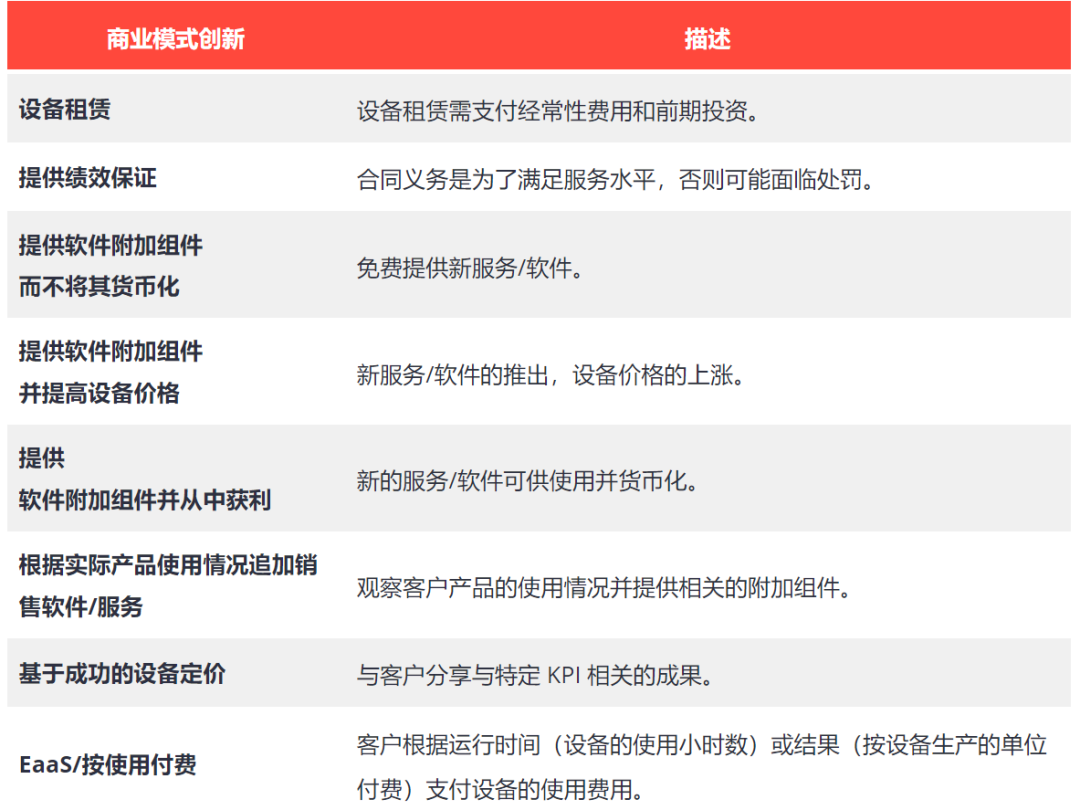 OEM厂商们面临的另一大挑战是使互联产品的收入具有意义。由于一些设备的成本达到数十万美元,相关软件的成本仅为此成本的一小部分,因此许多OEM仍在努力使互联产品的业务对公司的营收和利润产生足够的意义。解决这个问题的一种方法是设备即服务模式(EaaS),在报告中,EaaS正是最具创新性、也是最复杂的各种创新商业模式之一。
