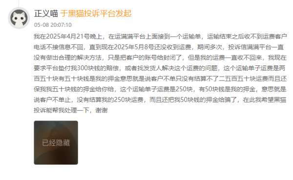 2025年5月8日,黑猫投诉上有这样一条投诉内容:2025年4月21日晚上,某司机在运满满平台上面接到一个运输单,运输结束后收不到运费,也无法联系上客户,到了5月8日仍然没有收到运费,在运满满平台投诉,平台只是封闭了客户的账号,司机还是无法拿到运费。类似遭遇的还有其他司机,2025年4月30日有司机投诉,在运满满接到单子送完货后,平台收了司机的押金和佣金,客户不给运费,平台不管不问,一直拖着运费不给。